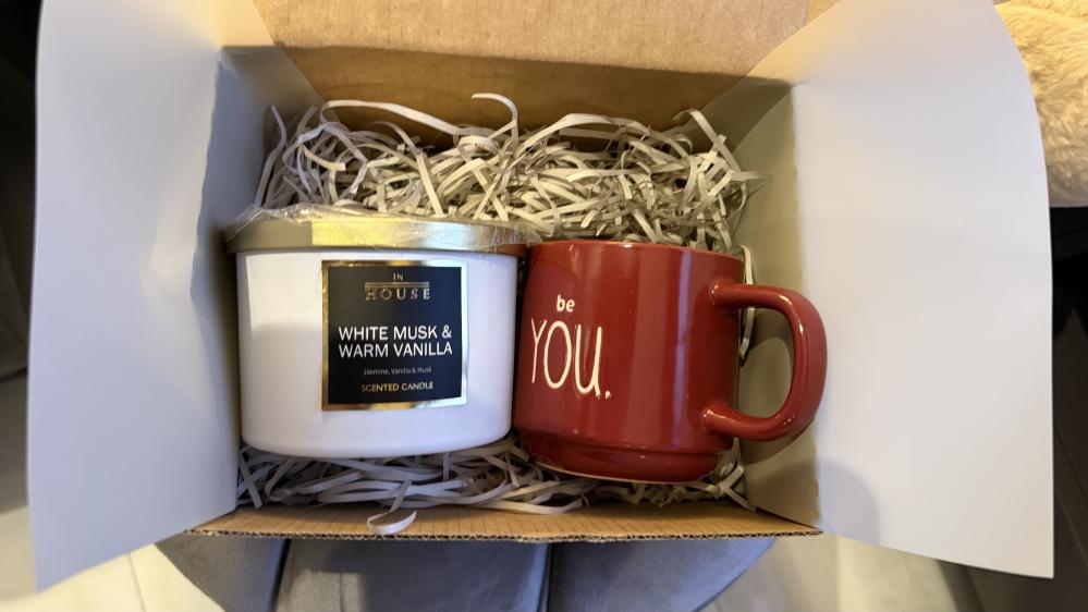 امنحي لحظات دافئة لا تُنسى مع علبة الهدايا الفاخرة التي تجمع بين كوب أنيق يحمل رسالة ملهمة وشمعة عطرية بنفحات المسك والفانيلا تضيف أجواء مريحة وهادئة لأي مساحة.